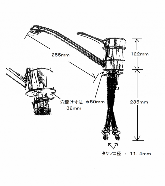 本体高さ113mm、ノズル長215mm、穴開寸φ32mm、タケノコ径φ10mm