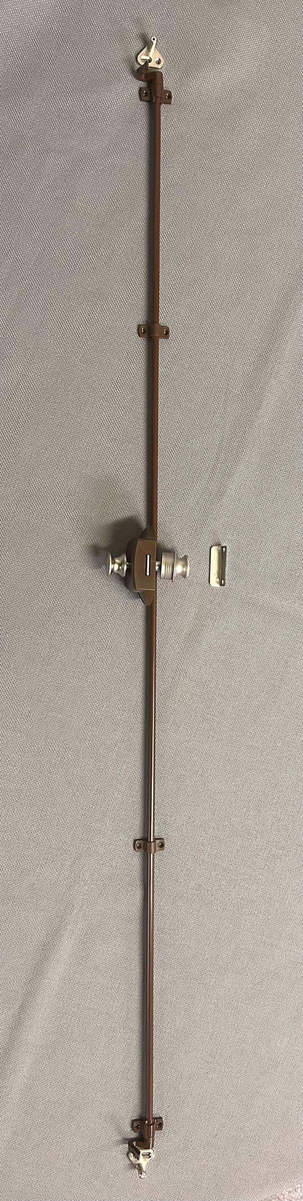 クローゼットなどの少し大きめな扉にももちろん使用できます。内側のシャフトにより上下を固定しますので、扉を反り返らず気密性も高まります。ノブを押し出すとロックが解除され、又押すとロックされます。ロック時は、ノブが扉と平になり邪魔になりません。扉に合わせてシャフトも短くできます。(シャフト 100㎝×2本付属)