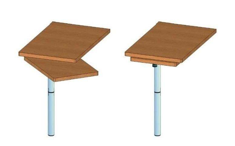 段違いに取り付けた2枚の天板を回転させることによって、テーブルを広く使用できます。