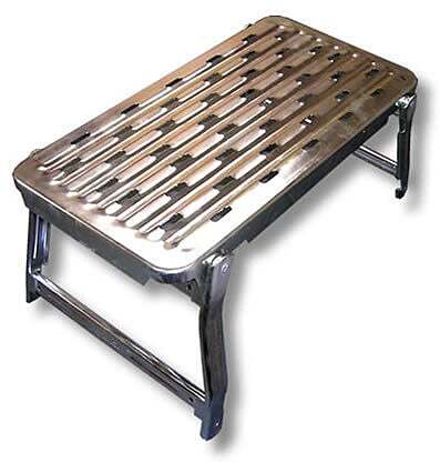 キャンピングトレーラーのステップや少し高い所に手を伸ばして作業をする際にあれば便利な折畳みステップは如何でしょうか?足を畳んだ状態ですと厚さが45㎜と極薄なので、ちょっとした隙間に収納可能で場所も取りません。また、こういったステップは幾つかあれば共同作業にも役立ちます。