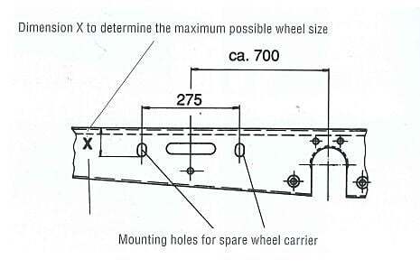 フロントトランクにスペアタイヤを保管しても良いですが、アルコ社フレームを使用したトレーラーであれば、このスペアタイヤホルダーを使用することで加工なしで車体下にタイヤを収納することができます。